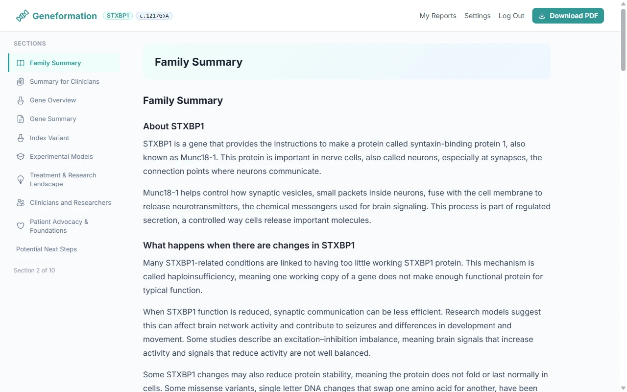 Enter your gene and variant. Get a structured research report with linked sources. Read online in your personal report dashboard, or download a professionally formatted PDF.